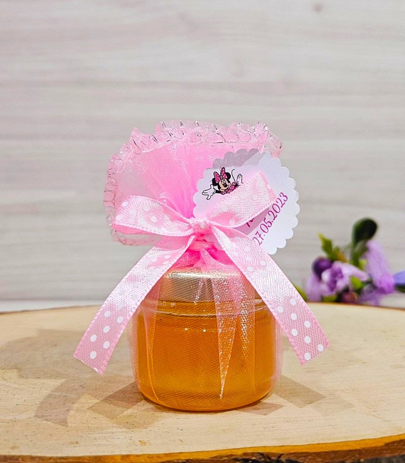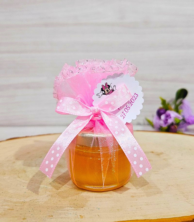 Marturie borcanel miere in saculet de organza roz accesorizat cu fundita satin roz cu buline albe.