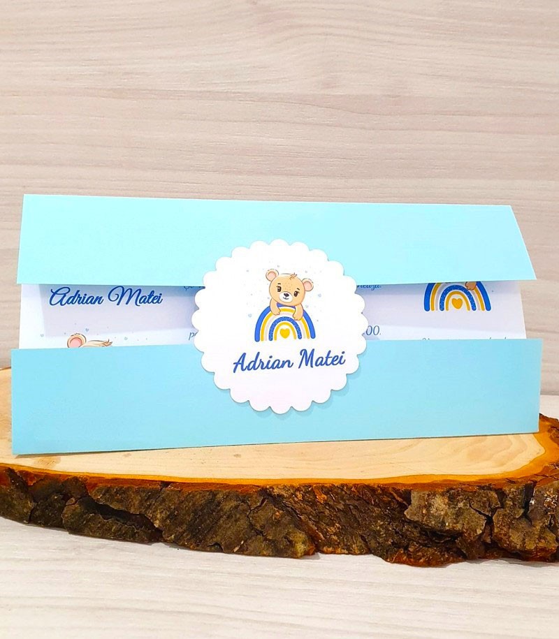 Invitatie confectionata din carton alb mat, coperta blue si lipita o eticheta.