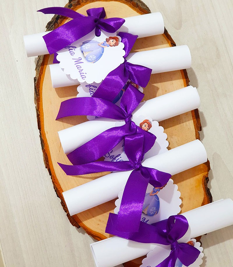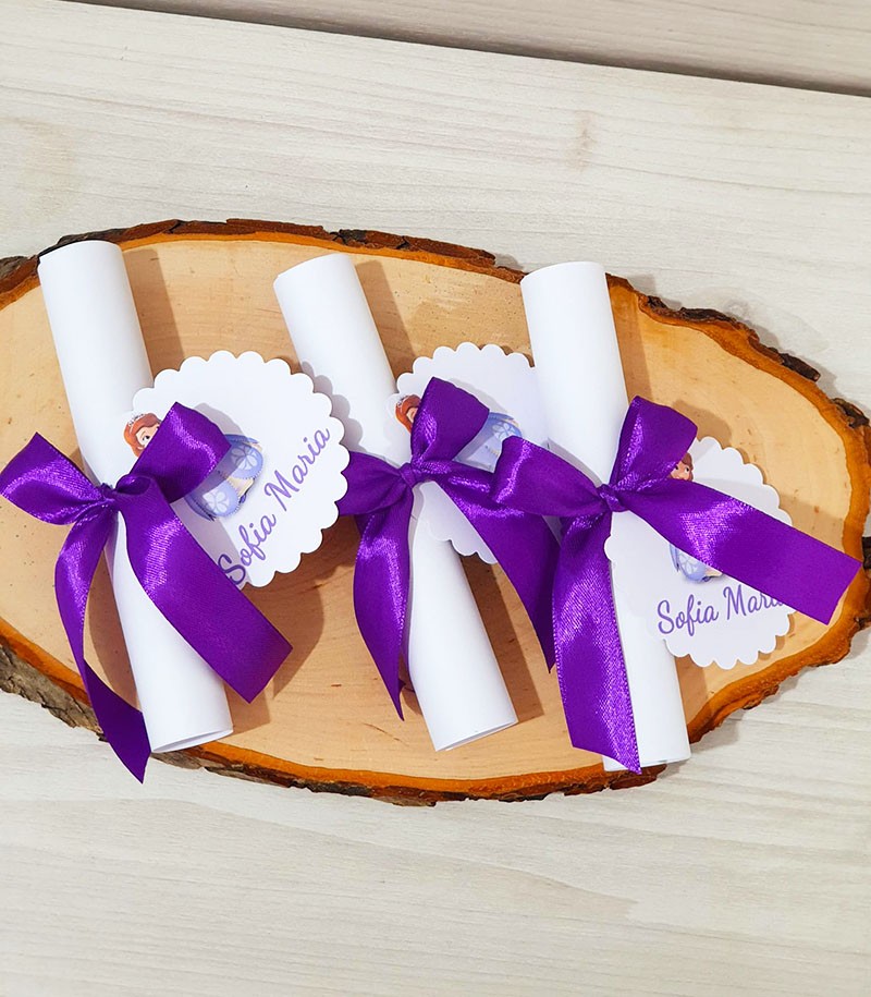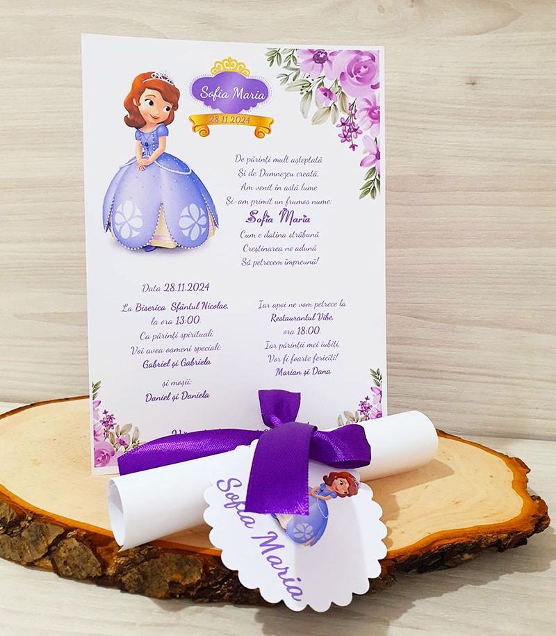 Invitatie de botez confectionata dintr-un carton alb mat, accesorizat cu funda mov satin.