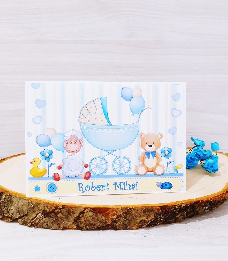 Invitatie de botez pentru baietei cu animalute si carucior bleo
