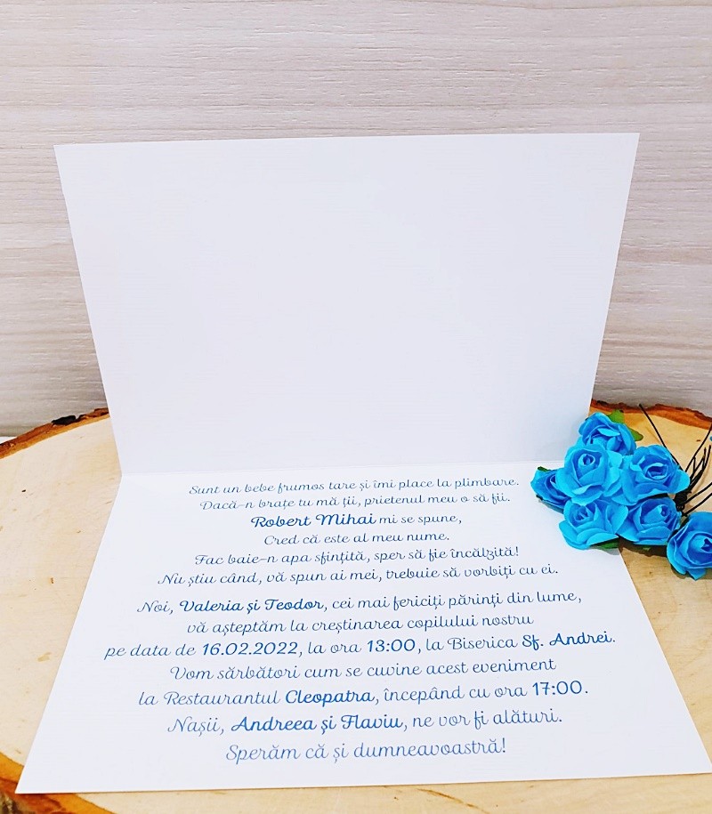 Pe exterior se regasesc desenele imprimate, iar in interior se afla textul invitatiei.