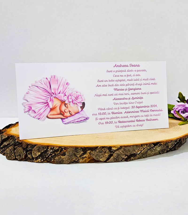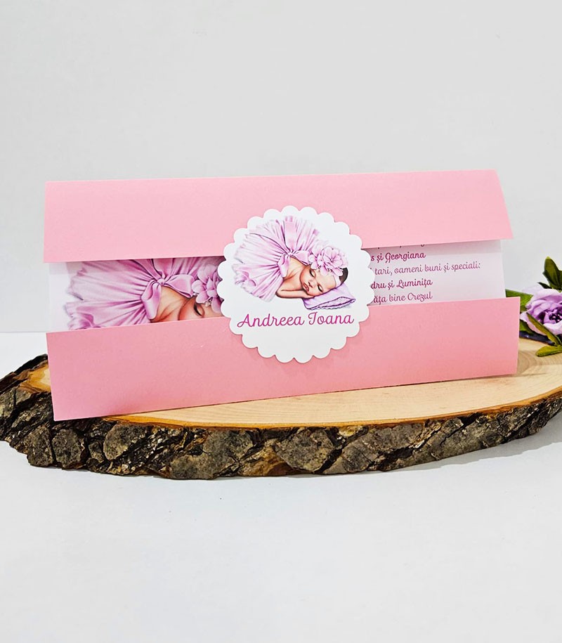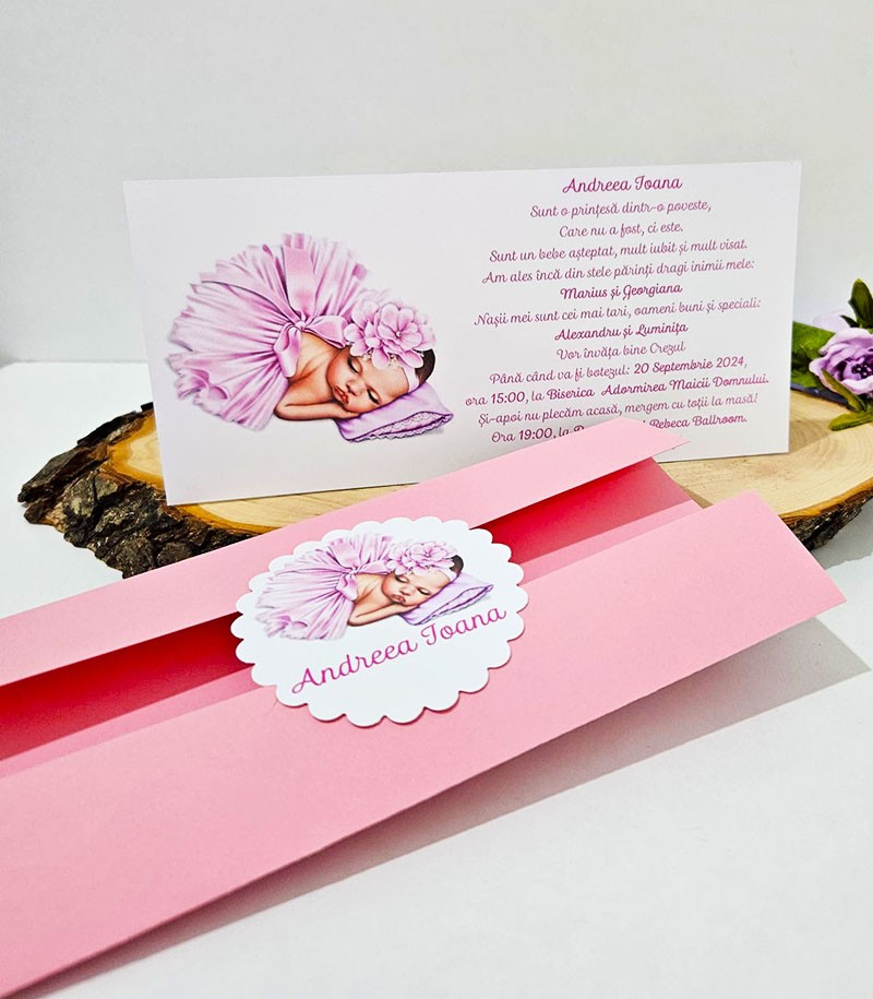 Invitatie de botez confectionata dintr-un carton alb mat si coperta roz.