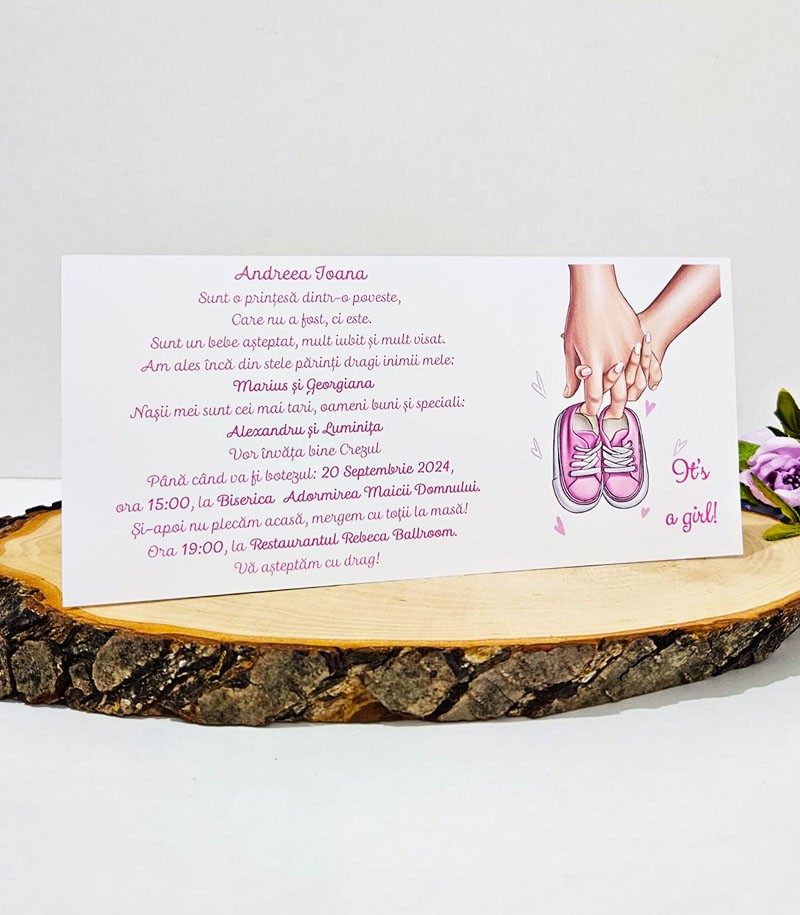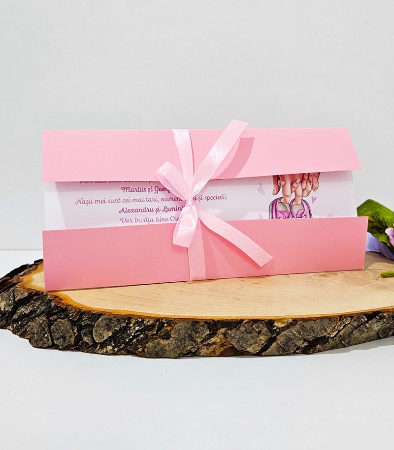 Invitatie de botez confectionata dintr-un carton alb mat si coperta roz.