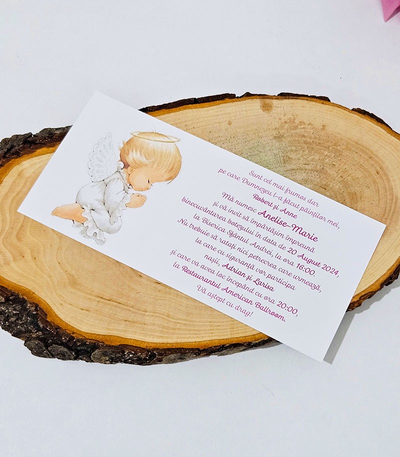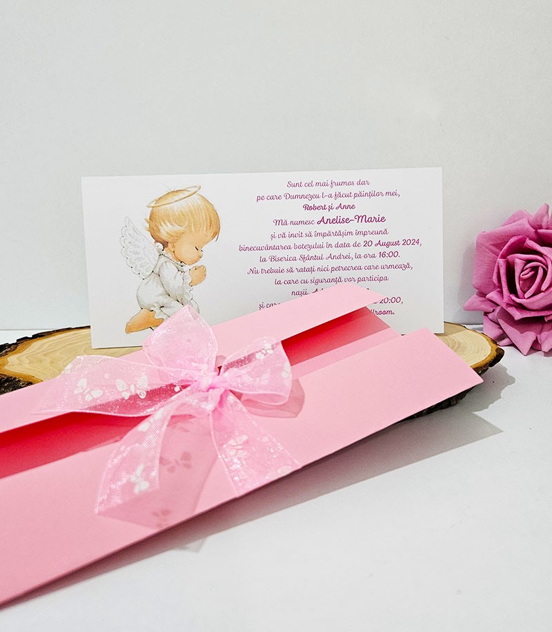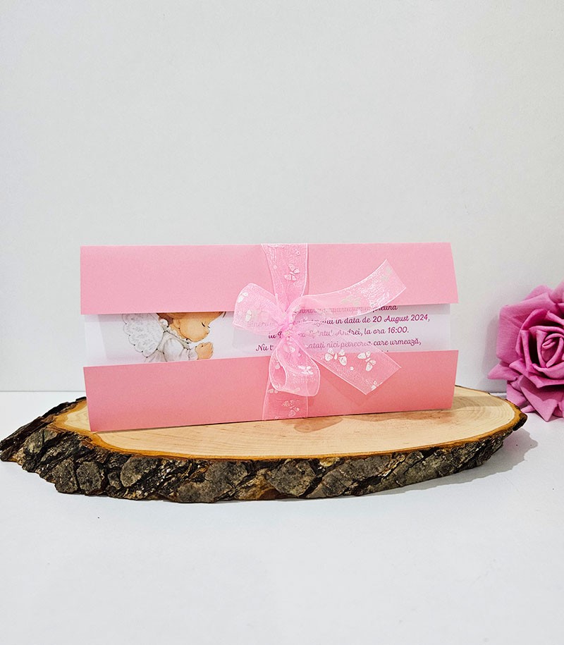 Invitatie de botez confectionata dintr-un carton alb mat si coperta roz.