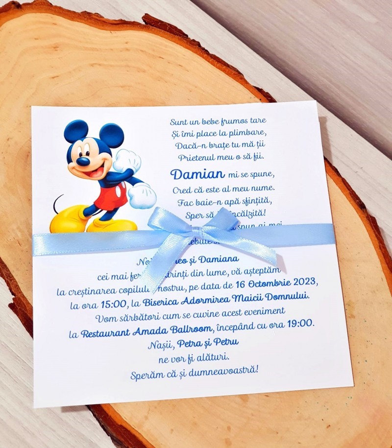 Invitatie botez pentru baietei confectionata dintr-un carton mat de culoare alba unde se regasesc desene cu tematica Mickey Mouse.
