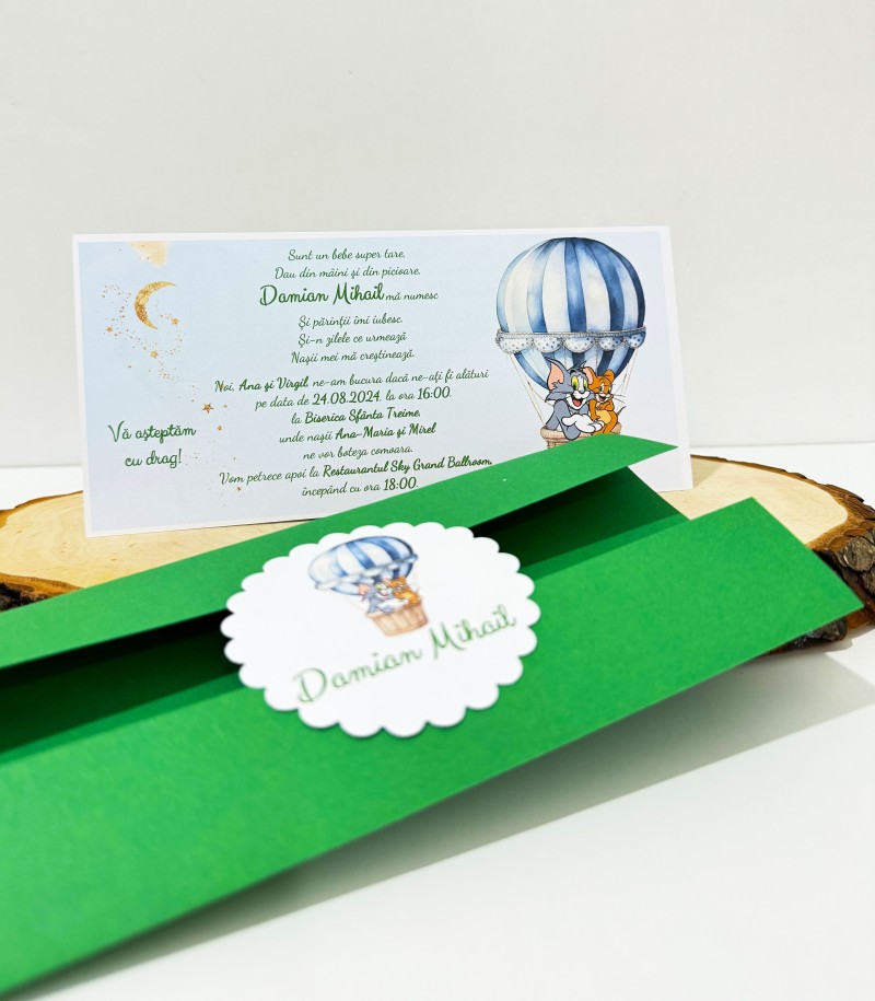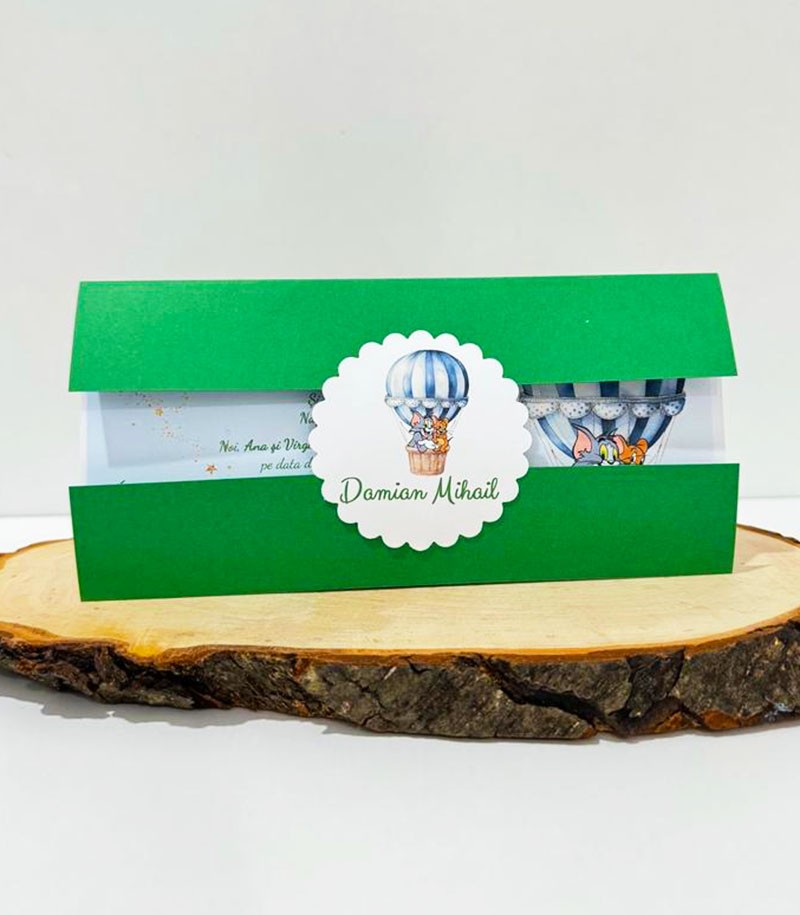 Invitatie de botez confectionata dintr-un carton alb mat si coperta verde si accesorizat cu eticheta.