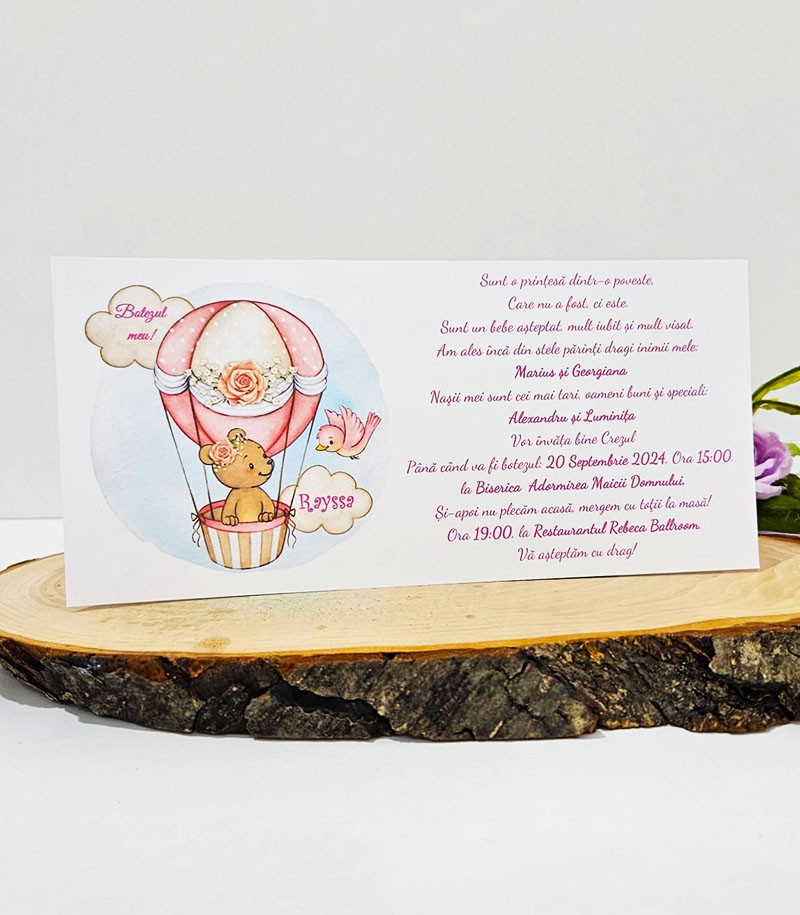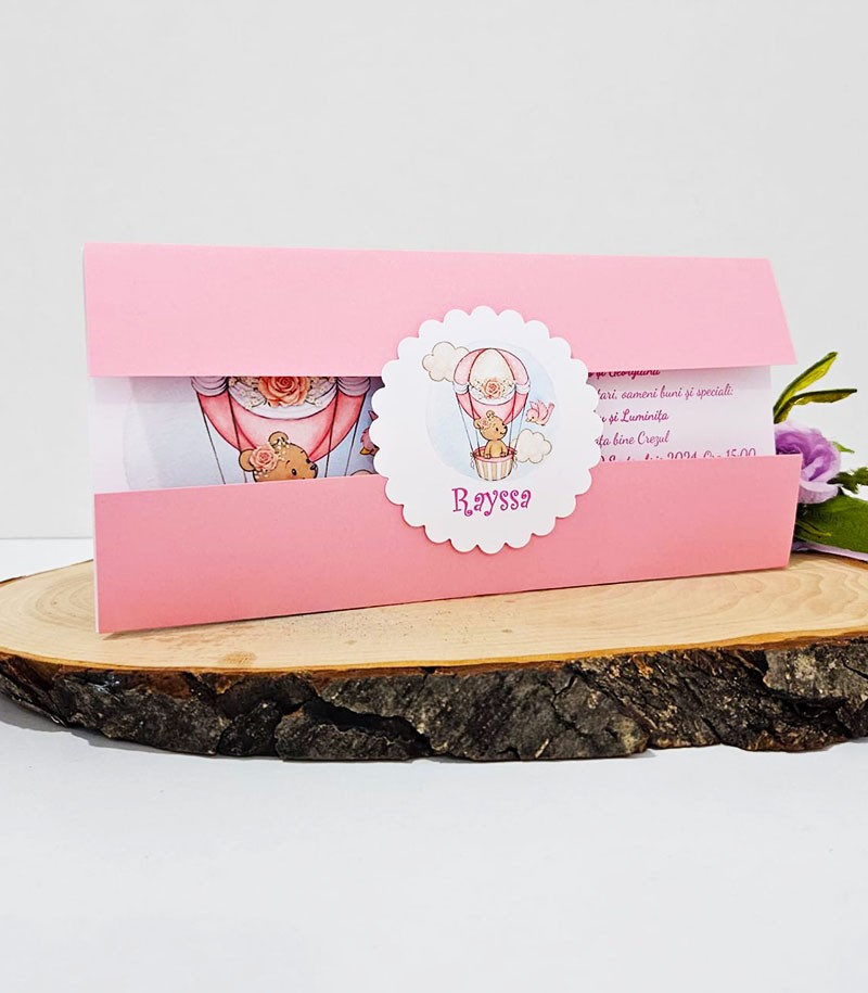 Invitatie de botez confectionata dintr-un carton alb mat si coperta roz.
