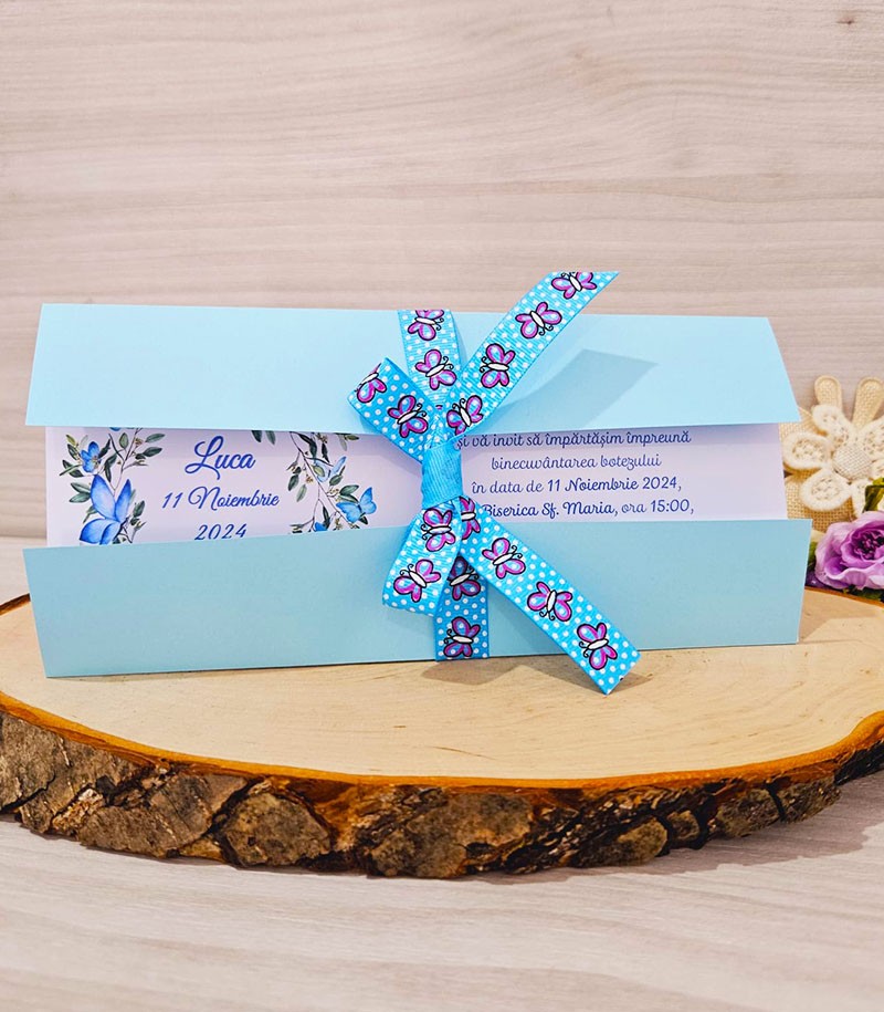 Invitatie de botez confectionata dintr-un carton alb mat si coperta bleo si accesorizat cu fundita cu fluturasi.