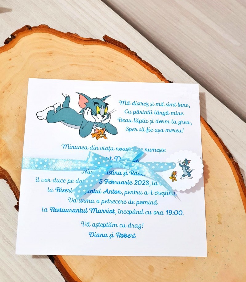 Invitatie botez pentru baietei confectionata dintr-un carton mat de culoare alba unde se regasesc desene cu tematica Tom si Jerry.
