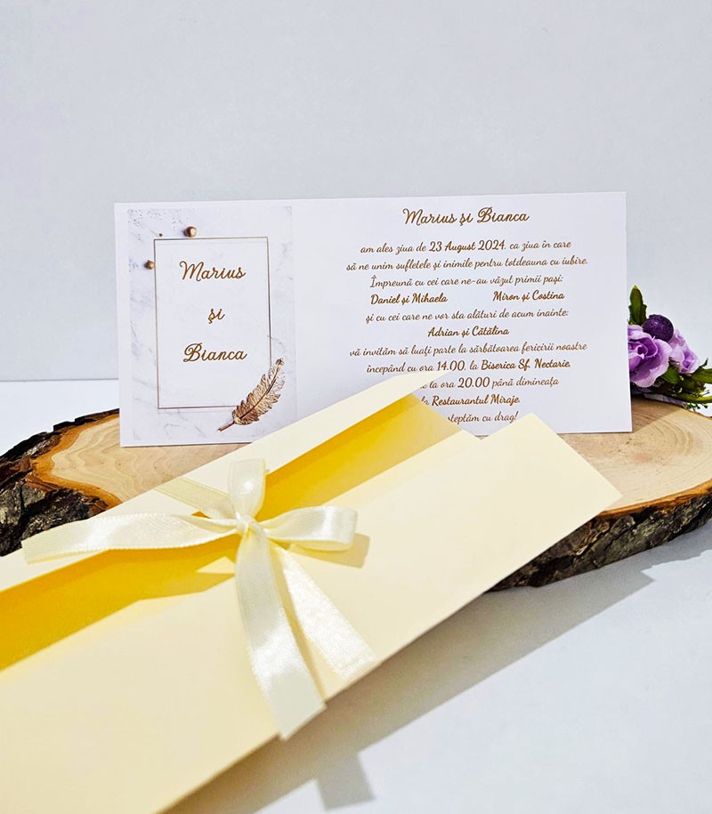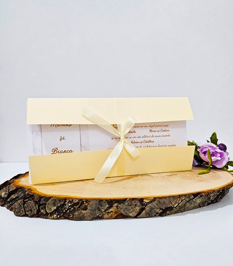 Invitatie de nunta confectionata dintr-un carton alb mat, coperta crem.