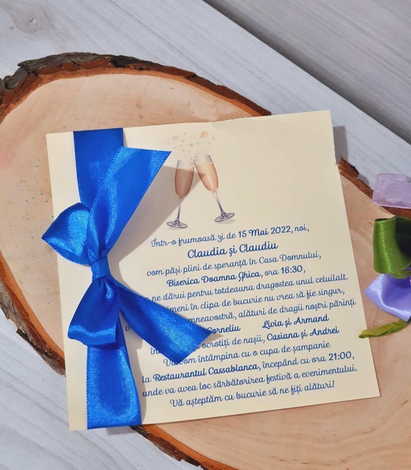 Invitatie de nunta confectionata dintr-un carton crem mat.