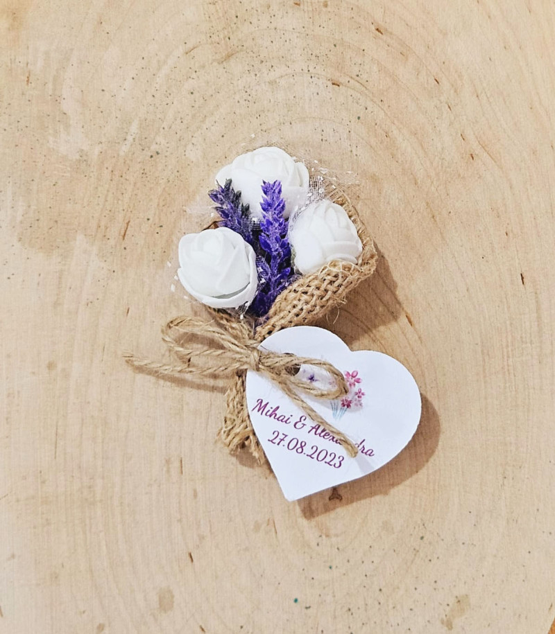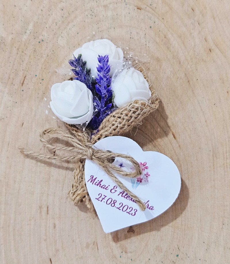 Buchetel format din 3 trandafirasi din spuma accesorizati cu iuta. Dimensiune aproximativ 7 cm