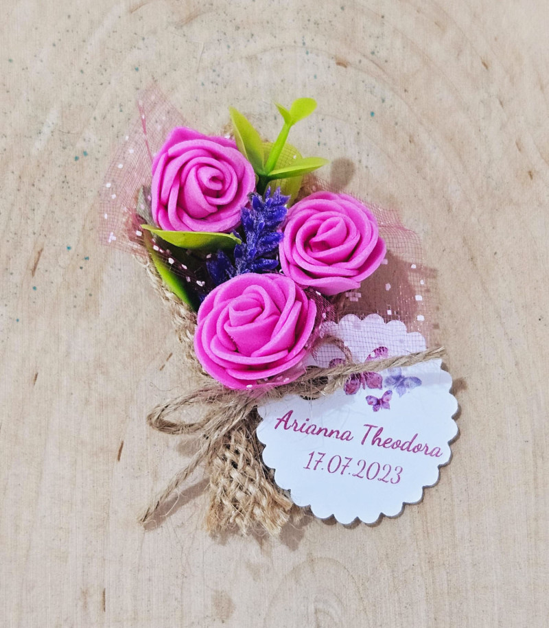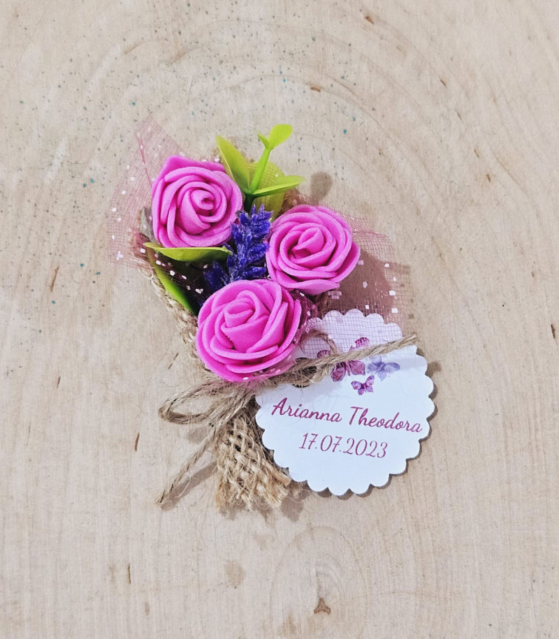 Buchetel format din 3 trandafirasi din spuma accesorizati cu iuta. Dimensiune aproximativ 7 cm
