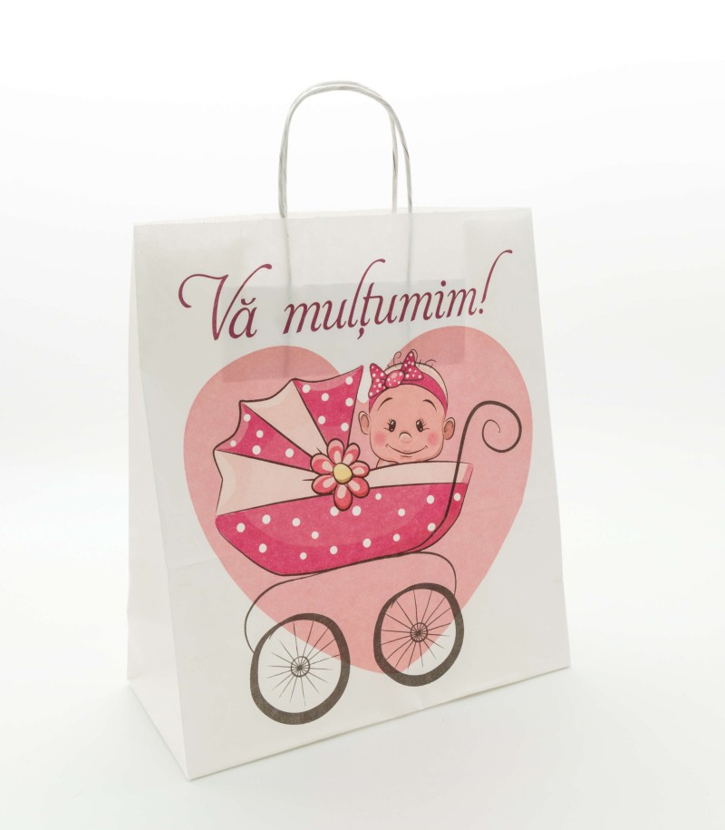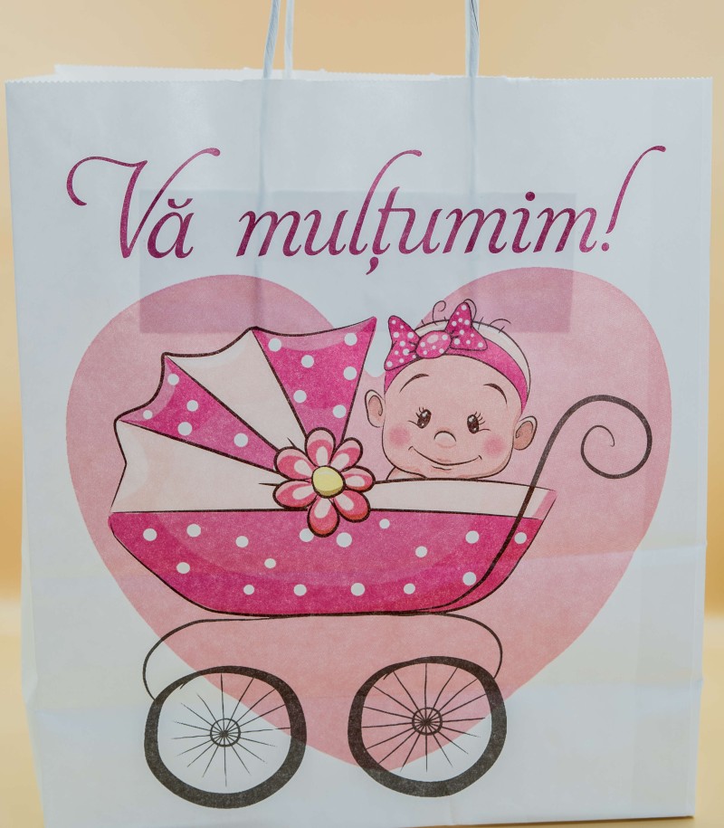 Pungi pentru botez fetite, de 90g/mp. Au imprimat o bebelina in carucior si sunt potrivite pentru a inmana oaspetilor dvs o cutie de prajituri de 500, 300 sau 200 g si o sticluta cu alcool.
