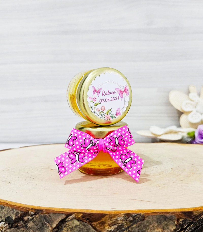 Marturie borcanel miere accesorizat cu fundita satin model fluturasi.