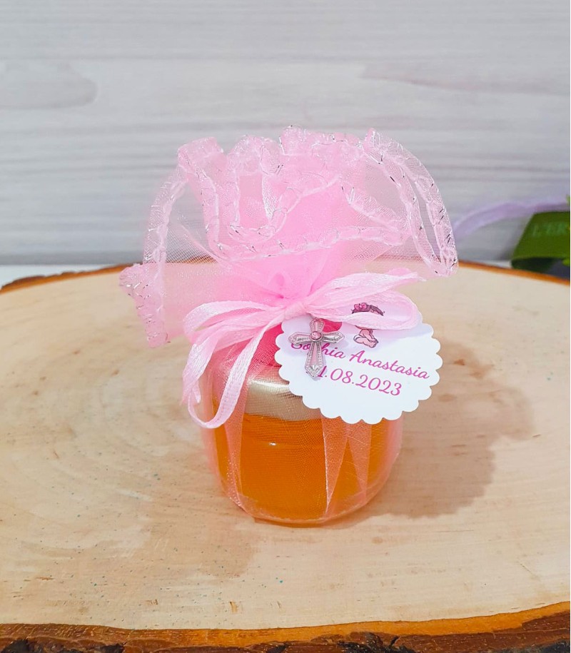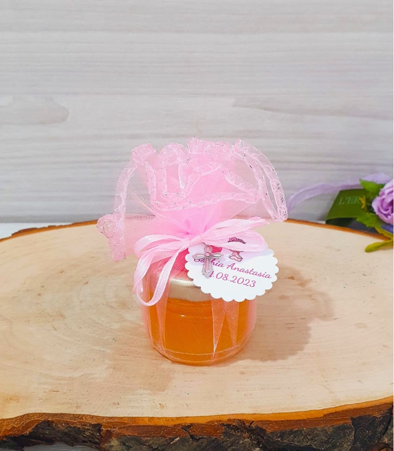 Marturie borcanel miere accesorizat cu saculet roz si cruciulita.