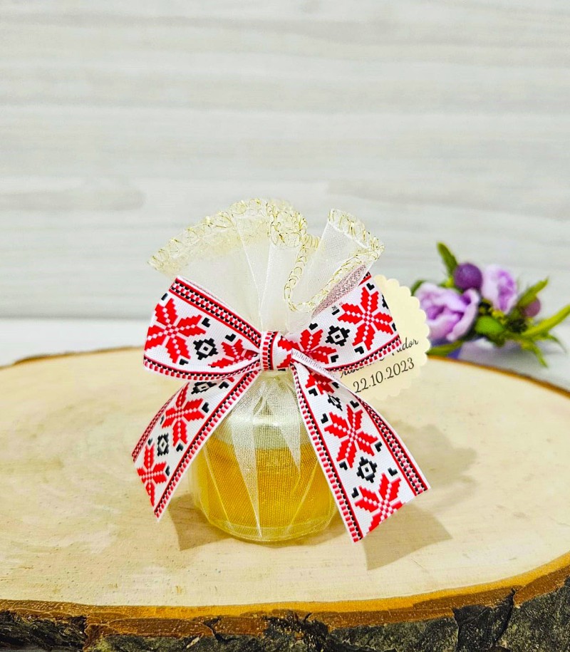 Marturie borcanel miere in saculet de organza crem accesorizat panglica satin traditionala.