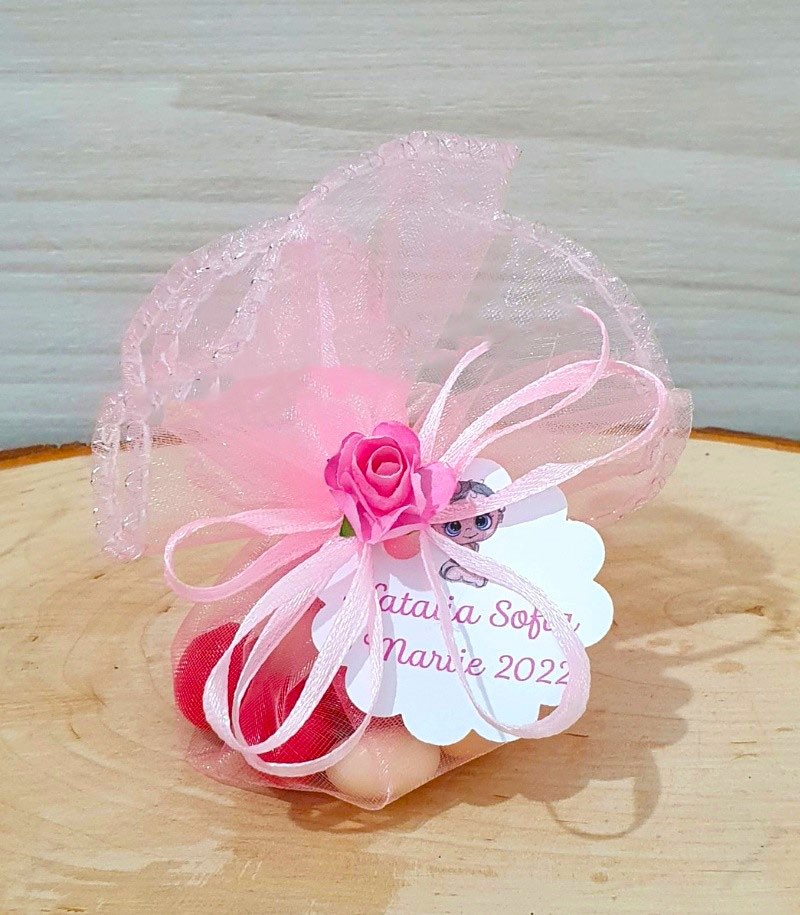 Marturie dulce cu bomboane alb-roz in saculet de organza roz, accesorizat cu trandafis de aceeasi culoare.
