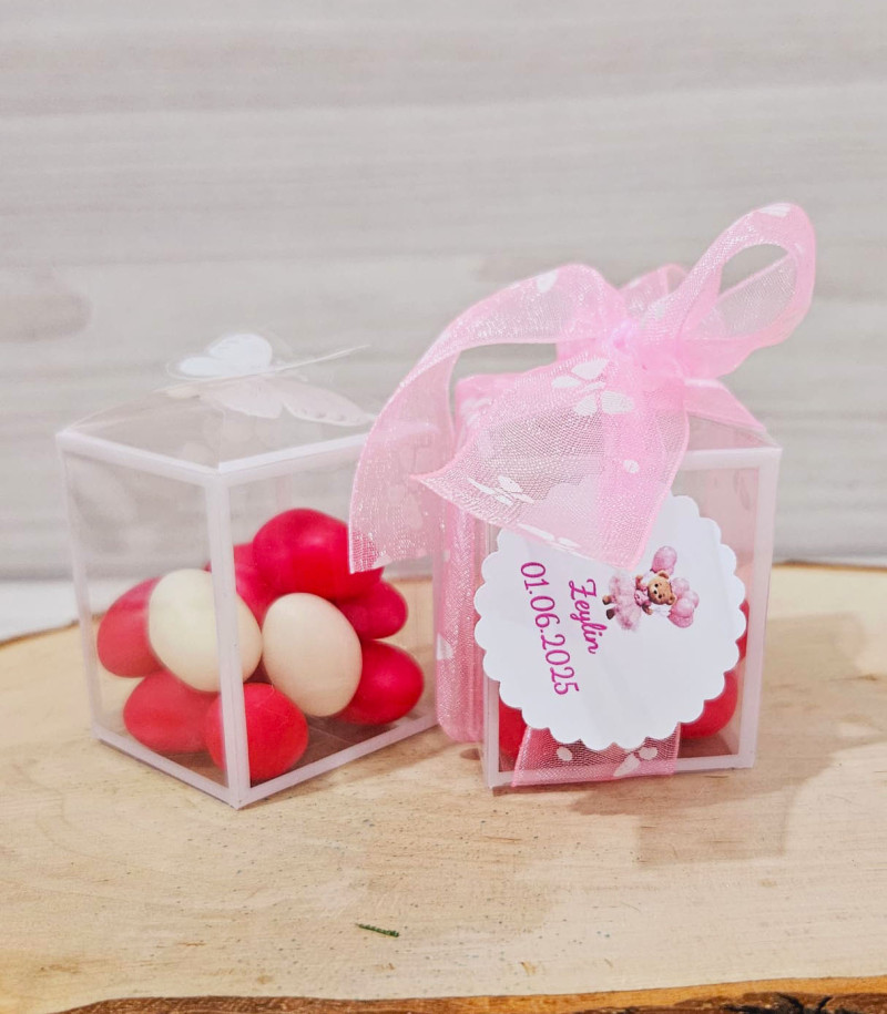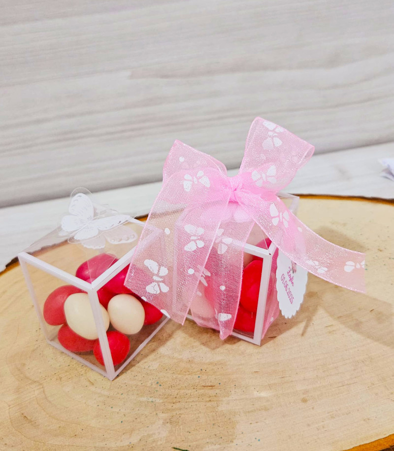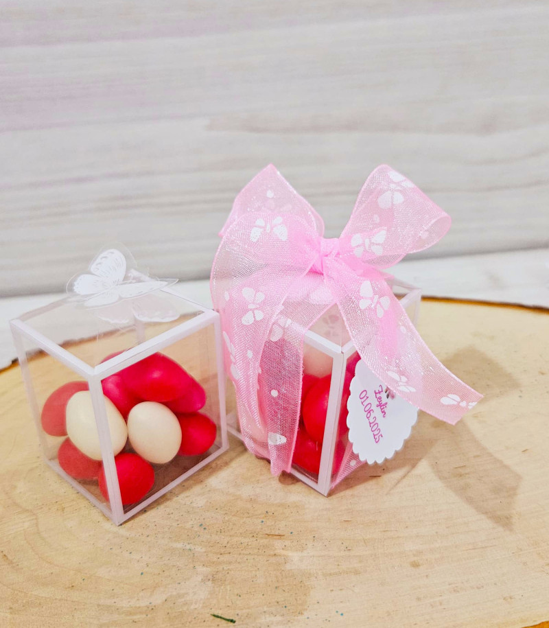 Marturie dulce cu bomboane alb-roz in cutiuta, legata cu funda de organza roz.
