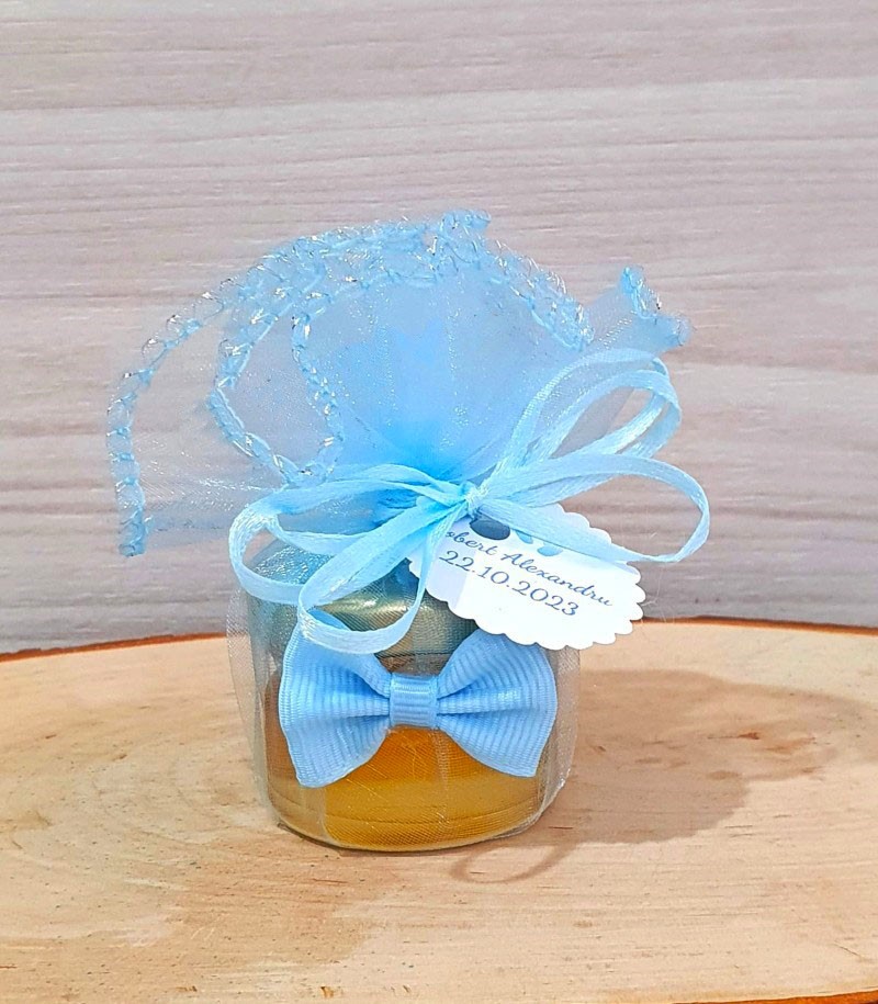 Marturie borcanel miere in saculet de organza bleo accesorizat cu papion bleo.