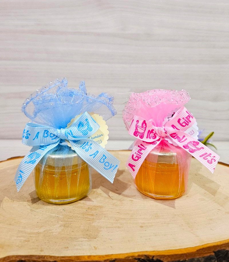 Marturie borcanel miere in saculet de organza roz/bleo accesorizat cu fundita satin roz It's a girl! si bleo It's a boy!.