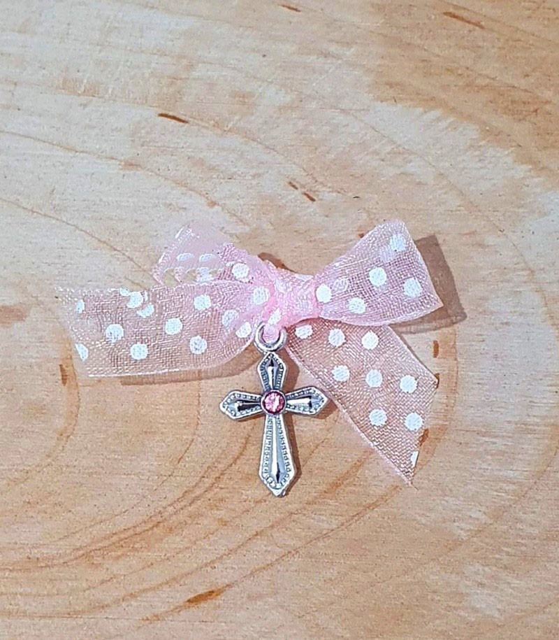 Cruciulita de botez metalica cu piatra roz in mijloc, la care se ataseaza fundita de organza transparenta cu buline.