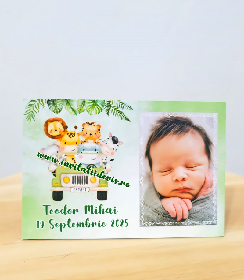 Marturie botez pentru baietei cu tematica animalute zoo, culoare predominanta verde. Magnetii se pot lipi pe frigider sau pe alta suprafata metalica, se personalizeaza cu numele, data evenimentului si poza bebelusului.
