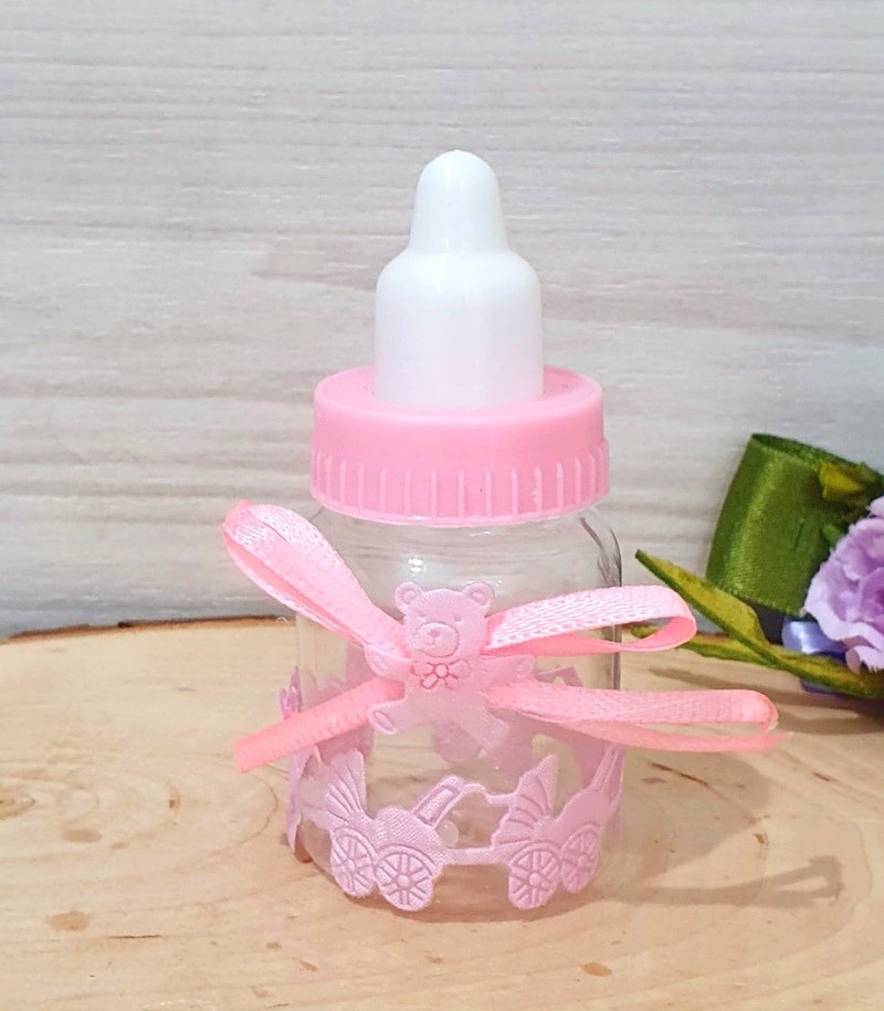 Marturie biberon roz pentru fetite, ce poate fi daruit simplu sau umplut cu bombonele.