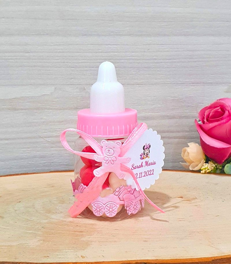 Marturie botez in forma de biberon, umplut cu bomboane alb roz.