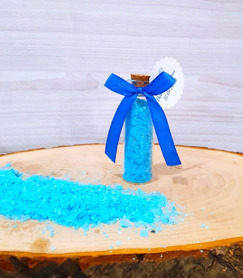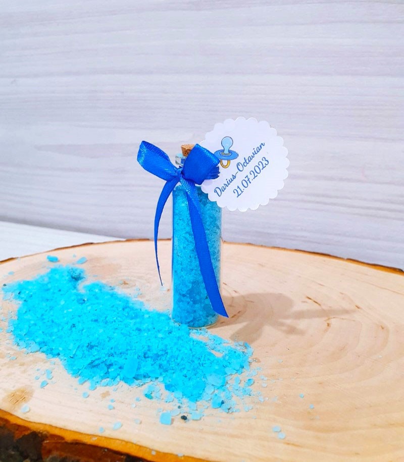 Marturie botez sare de baie parfumata in sticluta, accesorizata cu fundita satin albastru.