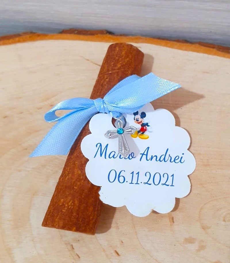 Marturie de botez baton scortisoara, accesorizat cu o fundita bleo si cruciulita metalica cu piatra albastra.