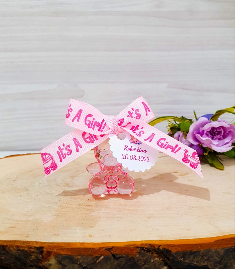 Marturie ursulet realizat din polimer transparent, accesorizat cu fundita text it's a girl.