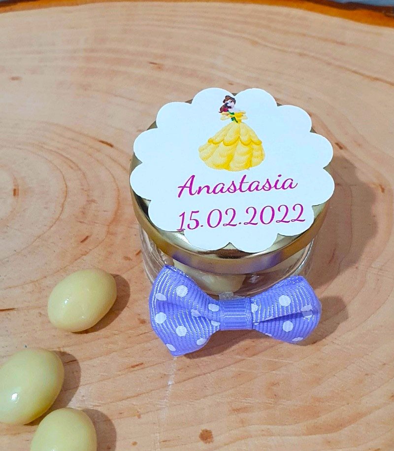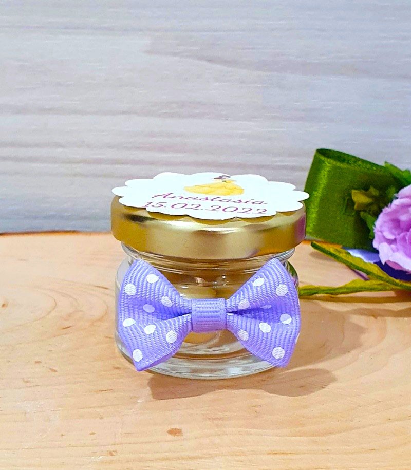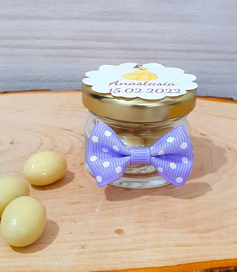 Marturie dulce pentru fetite cu bombonele dulci in borcanel, accesorizat cu fundita lila si buline albe.