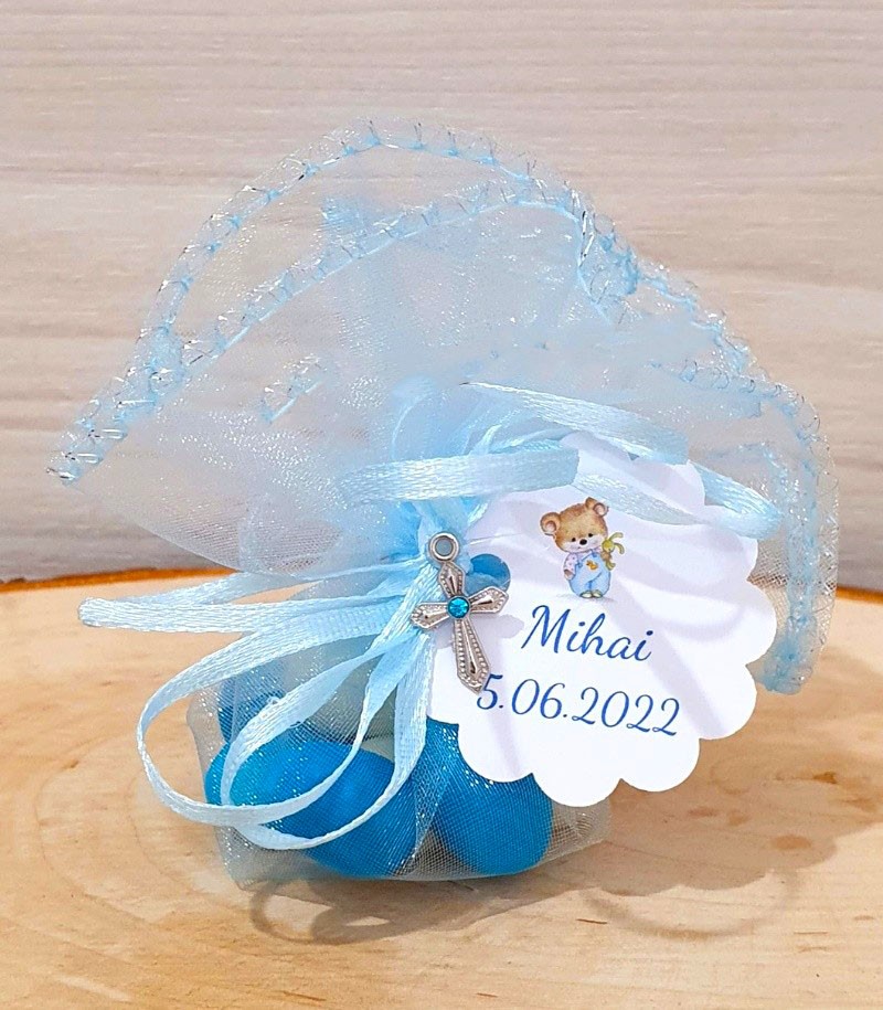 Marturie dulce cu bomboane alb-albastru in saculet de organza blue, accesorizat cu cruciulita cu piatra blue.