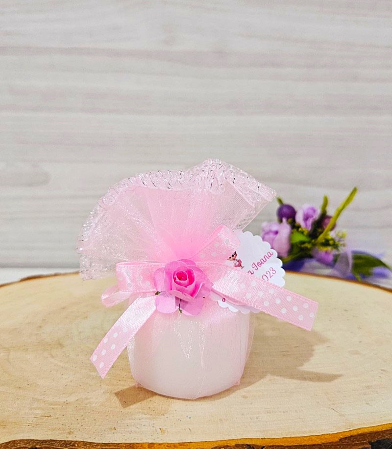 Marturie lumanare in saculet organza roz accesorizat cu fundita satin roz si buline albte.