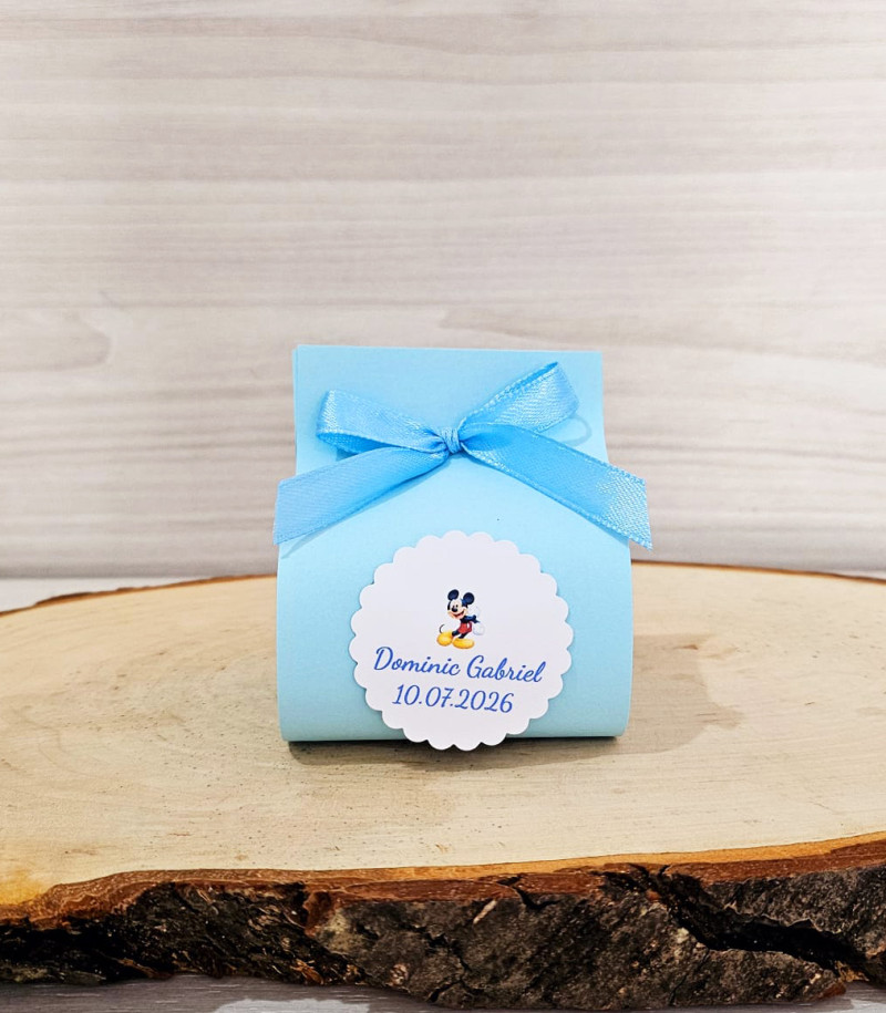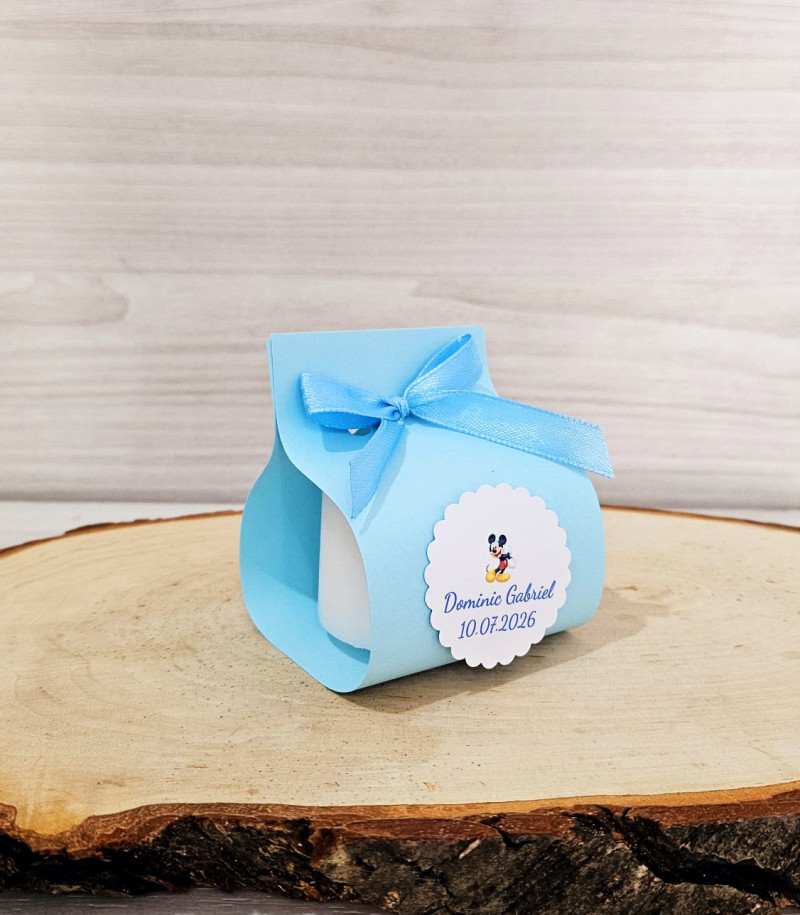 Marturie pentru botez formata dintr-o lumanare neparfumata introdusa intr-o cartonas bleo si accesorizat cu fundita bleo.