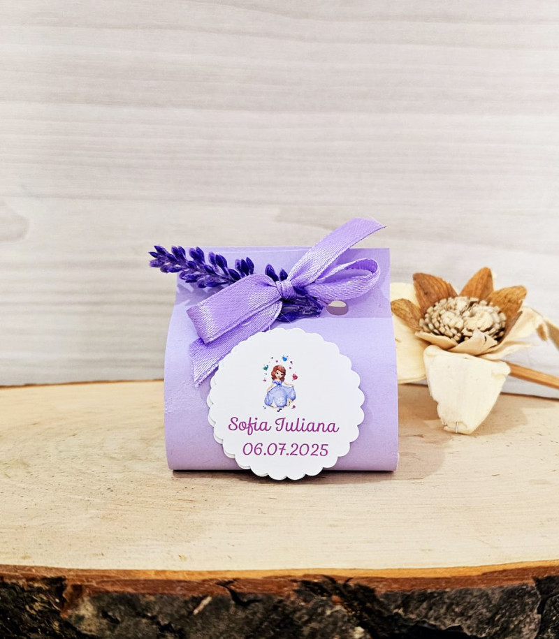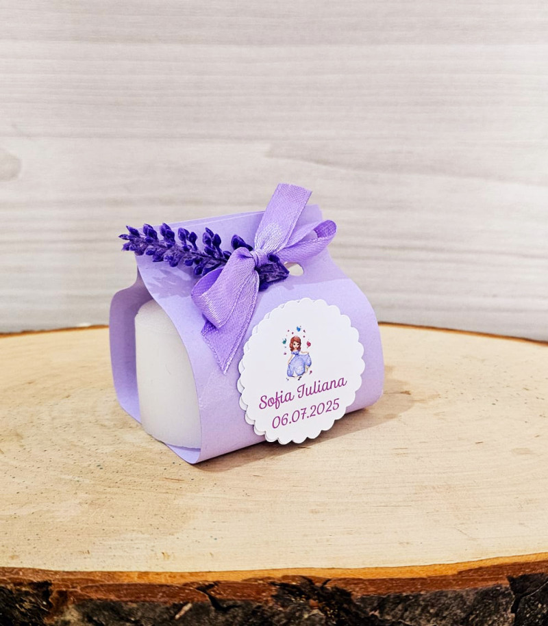 Marturie pentru botez formata dintr-o lumanare neparfumata introdusa intr-o cartonas lila si accesorizat cu fundita lila.