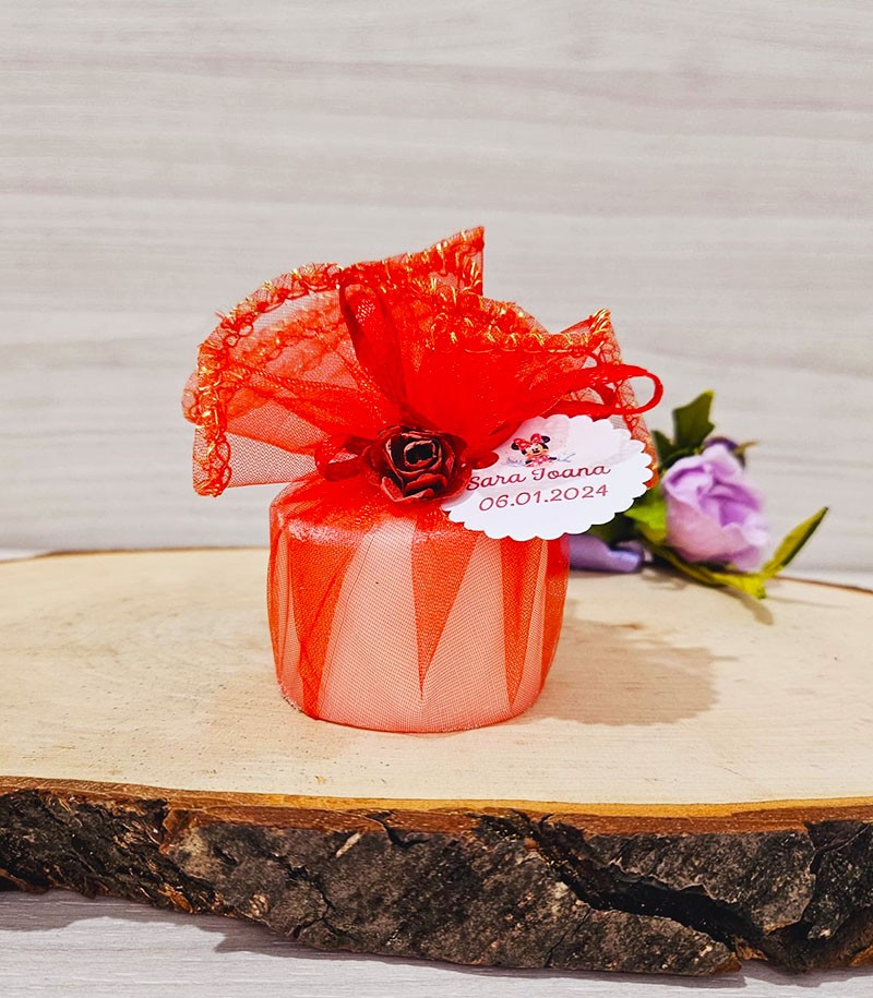 Marturie lumanare in saculet accesorizata cu trandafir.