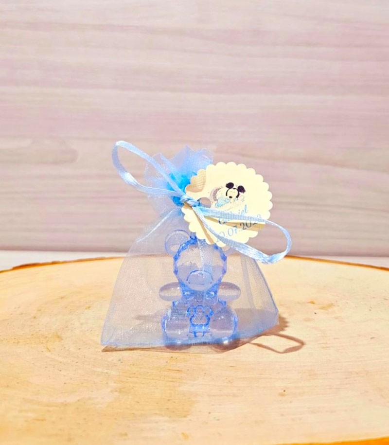 Marturie ursulet realizat din polimer transparent, introdus in saculet organza bleo.