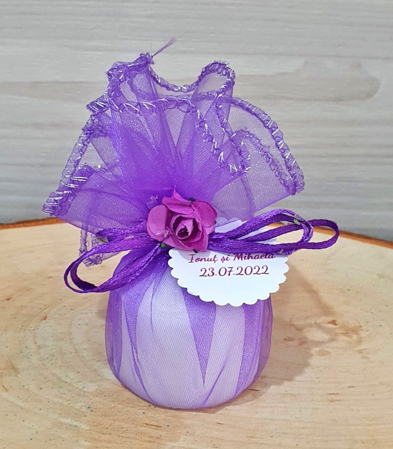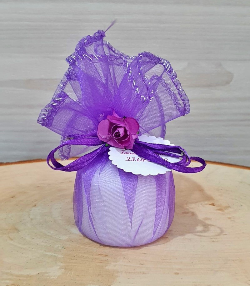 Marturie lumanare cu dantela alba in saculet organza mov.