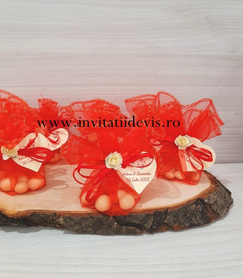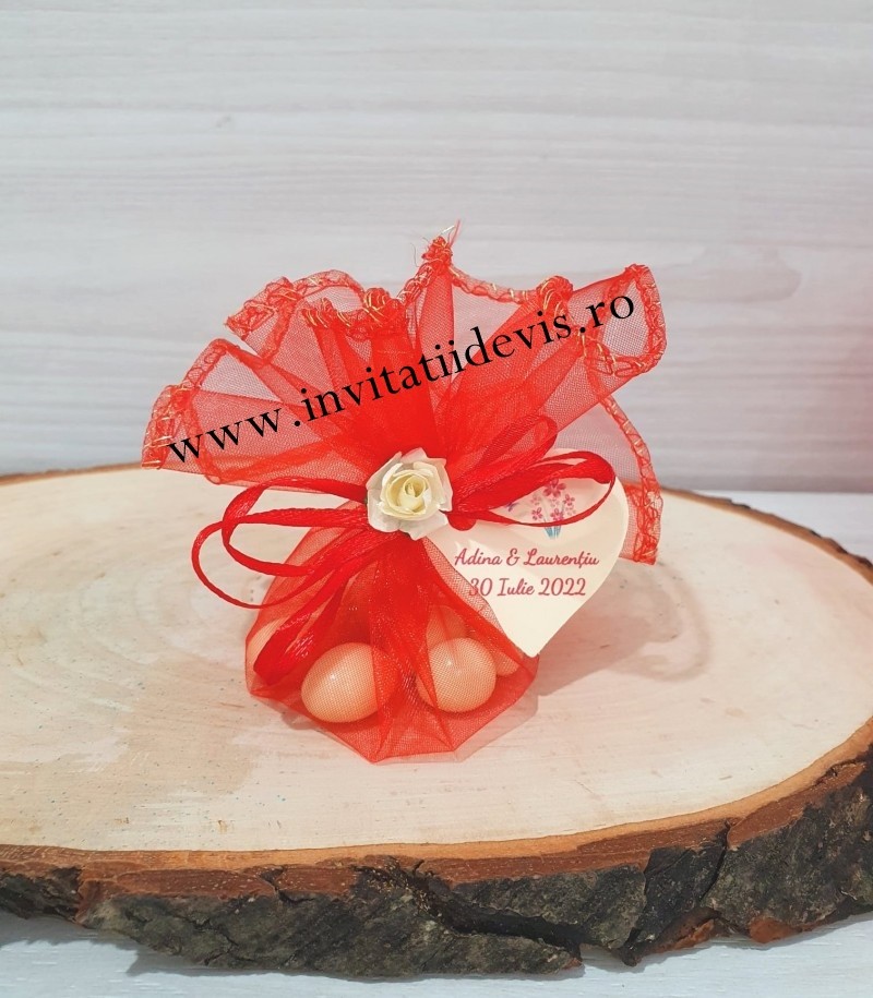 Marturie nunta sau botez in saculet organza rosu accesorizat cu trandafir crem, umplut cu 7 bomboane dulci.