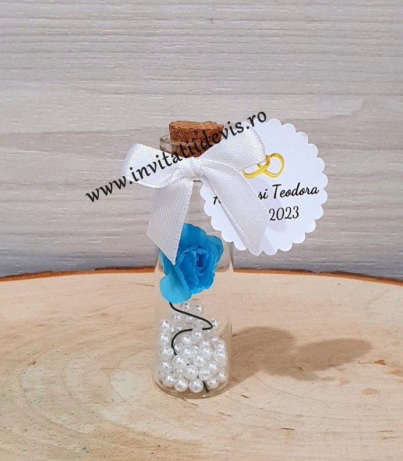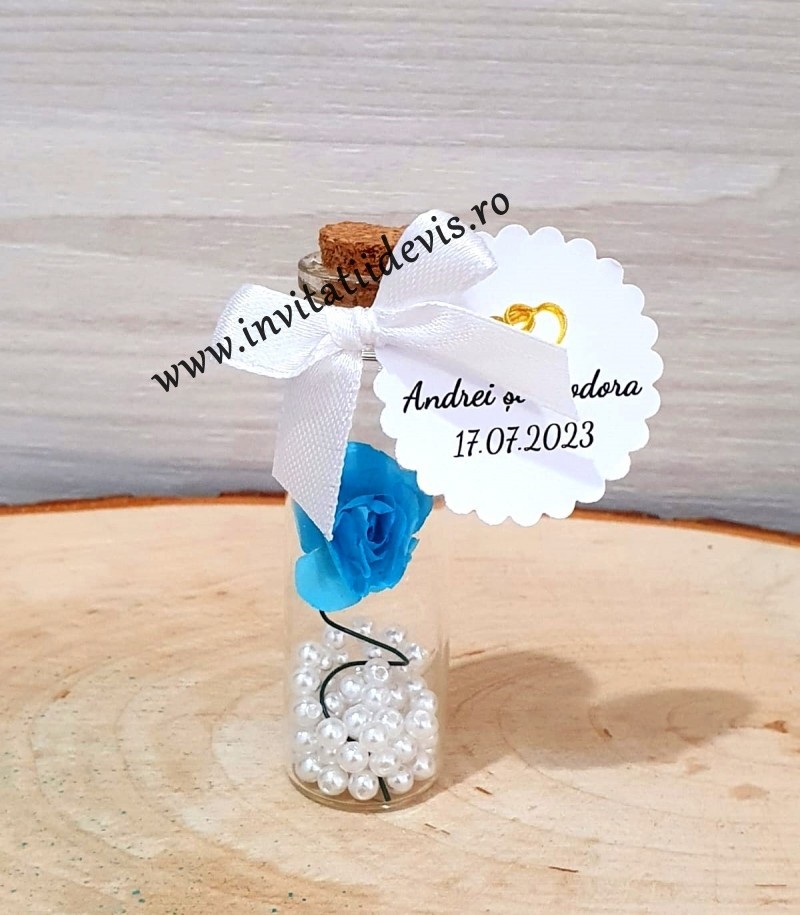Marturie speciala de nunta in sticluta umpluta cu perle albe si trandafiras blue.