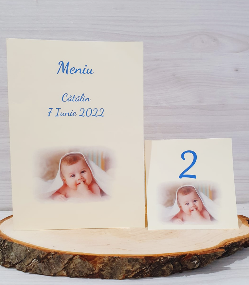 Meniu si numar de masa pentru botez model cu poza bebelusului